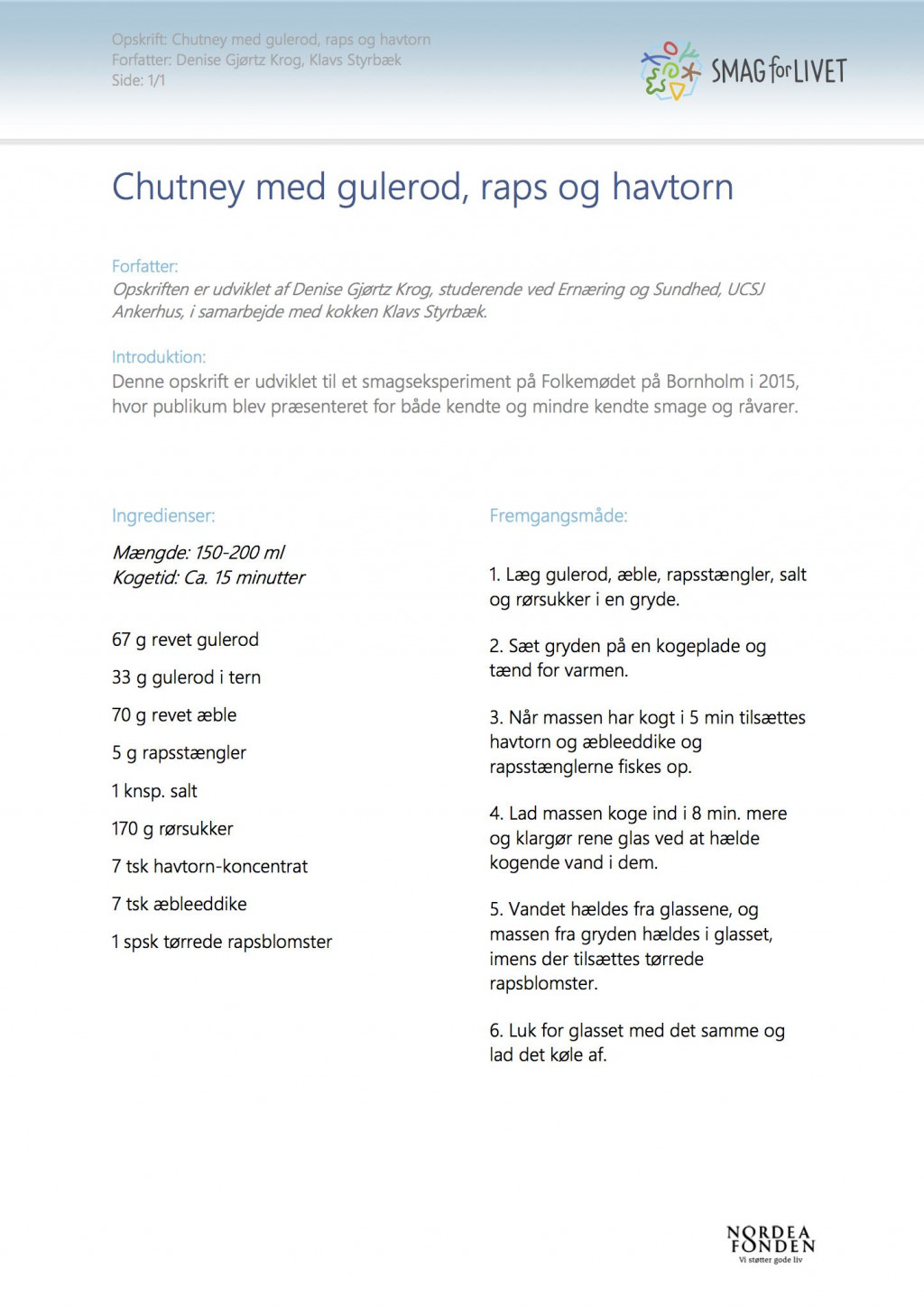 Madkundskab Kopiark og PDF Kopiark Hent alt som PDF Aktiviteter i forløbet 1 Purløgspesto 2 Suppe med vilde urter 3 Krydderurte-pesto 4 Chili sin carne m. wraps 5 Tang- og krydderurtepesto 6 Skov-te 7 Kyllingefrikadeller med krydderurter 8 Pesto med ramsløg 9 Chutney med gulerod, raps og havtorn 10 Skumfiduser med kamille Forfattere: Denise Gjørtz Krog, Klavs Styrbæk Vertikale faneblade Aktivitet Denne chutney er udviklet til et smagseksperiment på Folkemødet 2015, hvor publikum blev præsenteret for både kendte og mindre kendte smage og råvarer. Opskrift1Opskrift: Chutney med gulerod, raps og havtorn.