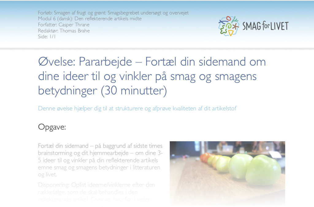 Dansk1. g2. g3. g Kopiark og PDF Kopiark Hent alt som PDFGiv din vurdering Indhold med samme tema Artikel (6) Aktiviteter i forløbet 1 Fællesmodul - dansk og kemi 2 Smagsbegrebet analyseret 3 Smag og genreformidling 4 Smag og den reflekterende artikel som genre 5 Smag, æstetik og tværfaglighed 6 Den reflekterende artikels midte 7 Den reflekterende artikels midte - sekundærlitteratur og diskurs 8 Oplæsning, refleksion og skrivning 9 Konvivialitet, fællesmåltid og gruppefremlæggelser Forfattere: Casper Thrane | Redaktør: Thomas Brahe Vertikale faneblade Aktivitet En skrivetime! Skriftlighed, refleksion, skriftlighed og refleksion… Aktivitet1Som forberedelse har eleverne arbejdet med egne noter samt genorienteret sig i en række tekster fra tidligere i forløbet. Se flere detaljer under forberedelse. 2Optakt Jørgen Leth, Mikael Simpson, Frithjof Toksvig, ”Gråpæren”, Ikke euforisk(2010) (cd)(15 min) Noter: ”Gråpæren”: Jørgen Leths spoken words som et essayistisk (og humanistisk) eksempel på smagen af gråpære som optakt på timens skriftlige undersøgelse af og refleksion over smag og smagens betydninger. Eksemplet er reflekterende, essayistisk og trækker både på fysiologisk, kulturel og individuel smagsforståelse; herunder tekstur, grundsmag, erindring, følelser m.m. Kan evt. også bruges til at repetere nogle af de mange begreber. 3Pararbejde – Fortæl din sidemand om dine ideer til og vinkler på emnet smag og smagens betydninger (30 min) Download opgavearket her. Noter: Fortæl din sidemand – på baggrund af sidste times brainstorm og dit hjemmearbejde – om dine 3-5 ideer til og vinkler på den reflekterende artikels emne smag og smagens betydninger. Disponering: Oplist ideerne/vinklerne efter den rækkefølge, som de skal behandles i artiklen. Overvej, hvorfor I vælger netop den rækkefølge (jf. f.eks. begreberne kohærens, progression, konkret og abstrakt samt ppt. om ”Den perfekte tekst” fra sidste modul.) Overvej i fællesskab, om I kan gøre ideerne endnu bedre ved evt. at være konkrete eller abstrakte, eller ved at videretænke dem. Husk på, at ideerne/vinklerne skal udfoldes som regulære afsnit med sammenhængende tekst i den reflekterende artikel. Overvej herefter, hvor og hvordan opgaveteksterne af Mouritsen/styrbæk, Plum og Ditlev Jensen kan indtænkes i artiklen. Gør det samme med sidemandens pointer. Jeres arbejde skal lægges ind på GoogleDrive. I skal kunne præsentere jeres ideer og vinkler for klassen herefter. 4Opsamling af ideer og vinkler på emnet smag og smagens betydninger (komposition og indhold) (20 min) 5Individuel skrivning ud fra pararbejde og klasseopsamling (15 min) Noter: Udvælg én af dine ideer/vinkler, og skriv dit første regulære udkast til et artikelafsnit. Sørg for, at du lever op til nogle af kravene for den reflekterende artikel; f.eks. kravet om almene erfaringer (abstraktion), som konkretiseres med personlige erfaringer og eksempler (konkretion). Du har 20 min til at skrive på dit afsnit, og du skal kunne læse det op afslutningsvis i timen. 6Opsamling på klassen med oplæsning af udkast m.m. (10 min) Noter: Diskussion af oplæsninger og tanker om, hvad der er let og svært. Evt: visning af Smag for Livets hjemmeside som en ekstra vidensbank om smag. Et eks. kunne være: http://www.smagforlivet.dk/materialer/smagen-af-kirseb%C3%A6r ForberedelseForberedelseFor eleverne gælder: Gennemlæs grundigt dine noter fra kemi- og dansktimerne i forløbet. Læs evt. i forløbets tekster. Vælg 3-5 af dine bedste vinkler på emnet smag, som du vil undersøge og reflektere over i din reflekterende artikel. Brug hjemmefra ca. 20 min på at brainstorme på dine vinkler, overvej evt. hvordan du vil være konkret og abstrakt. (Man kan evt. lade eleverne genlæse de tre tekster (Mouritsen/styrbæk, Plum, Ditlev Jensen fra 2. danskmodul), som skal inddrages i den reflekterende artikel) Vi skal i timen arbejde med den reflekterende artikels midterdel, herunder komposition og 3-5 vinkler på smag.