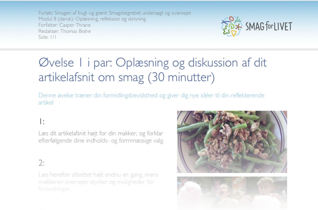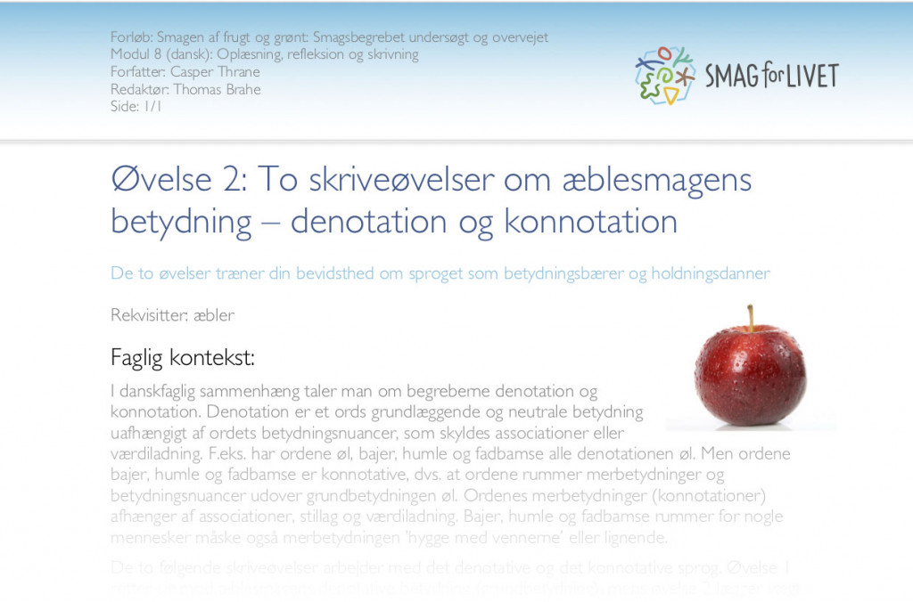 Dansk1. g2. g3. g Kopiark og PDF Kopiark Hent alt som PDFGiv din vurdering Indhold med samme tema De fem grundsmage (33) Artikel (6) Aktiviteter i forløbet 1 Fællesmodul - dansk og kemi 2 Smagsbegrebet analyseret 3 Smag og genreformidling 4 Smag og den reflekterende artikel som genre 5 Smag, æstetik og tværfaglighed 6 Den reflekterende artikels midte 7 Den reflekterende artikels midte - sekundærlitteratur og diskurs 8 Oplæsning, refleksion og skrivning 9 Konvivialitet, fællesmåltid og gruppefremlæggelser Forfattere: Casper Thrane | Redaktør: Thomas Brahe Vertikale faneblade Aktivitet Oplæsning, diskussion, sprog og smag. Aktivitet1Eleverne har som lektie hjemme bl.a. arbejdet videre på den reflekterende artikel. Se flere detaljer under forberedelse. 2Optakt: Grundsmagene repeteret ud fra Smag for Livets hjemmeside (15 min) Noter: Tre af de seks videoer vises som repetition: ”Sødt”, ”Bittert” og ”Stærk”: http://www.smagforlivet.dk/materialer/smagsfilm-oplev-grundsmagene-og-det-stærke Den sidste video vises som alternativ til grundsmagene, da stærk ikke er en grundsmag, men en følelse. Eleverne opfordres til, at medtænke alle grundsmagene i deres reflekterende artikler, selvom de måske kun har fokus på en eller to. Det er jo smag som begreb og smagsoplevelsen, de skal skrive om. Påmindelse om hjemmesidens mange artikler som godt læsestof til den reflekterende artikel: http://www.smagforlivet.dk/content/fakta-om-smag 3Pararbejde med oplæsning og diskussion af hjemmearbejde (30 min) Download opgaveark for øvelse 1 her. Noter: Læs dit artikelafsnit højt for din makker, og forklar efterfølgende dine indholds- og formmæssige valg. Læs herefter afsnittet højt endnu en gang, mens makkeren overvejer styrker og muligheder for forbedringer. Diskutér afslutningsvis afsnittets styrker og muligheder for forbedringer. Notér jeres vigtigste pointer. Gentag proceduren for den anden parts tekst. 4Klasseopsamling på gruppearbejde med oplæsning af udvalgte artikelafsnit (25 min) Noter: Begrundelse for valg af form og indhold – Den reflekterende artikel som genre. Oplæsning af afsnit. Klassediskussion af tekstens form og indhold: Gode pointer og muligheder for forbedringer. 5Øvelse: Smagen af æble X 2 - denotation og konnotation (20 min) Download øvelsesark 2 her. 6Lektieoptakt til afsluttende modul – Konvivialitet Noter: Lav en ret til 3-4 personer, som involverer frugt og/eller grønt. Din ret må gerne rumme en særlig (smags)betydning for dig. Du skal ganske kort kunne præsentere (smagen af) din ret i næste time. ForberedelseForberedelseFor eleverne gælder: Brug hjemme 30 min. på at skrive et afsnit færdigt til din reflekterende artikel. Afsnittet skal repræsentere én af din artikels vinkler på smag (eller indledning). Du må gerne skrive videre på ét af de afsnit, som du har skrevet på tidligere i forløbet; jf. modul 3, 4 og 7, hvor vi arbejdede med henholdsvis indledning, konkretion/abstraktion og inddragelse af sekundærlitteratur. Du skal kunne begrunde indholdet og formen af dit afsnit i timen. Afsnittet skal desuden kunne læses op. Evt: Ekspertgruppe om Susanne Højlunds "Smag". Enten lærer eller elever: Husk ét stk. æble til hver elev.